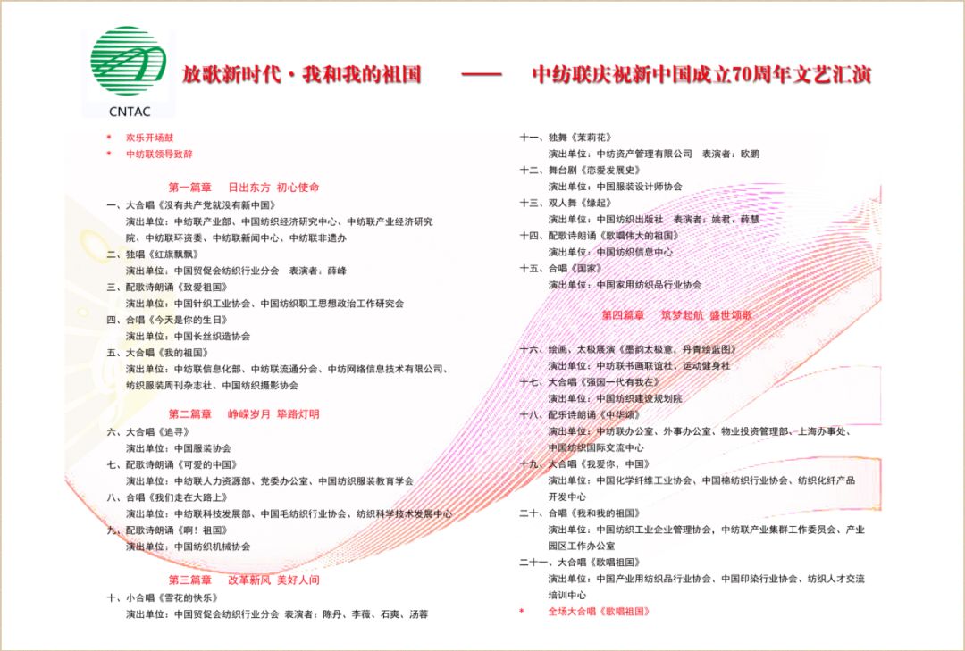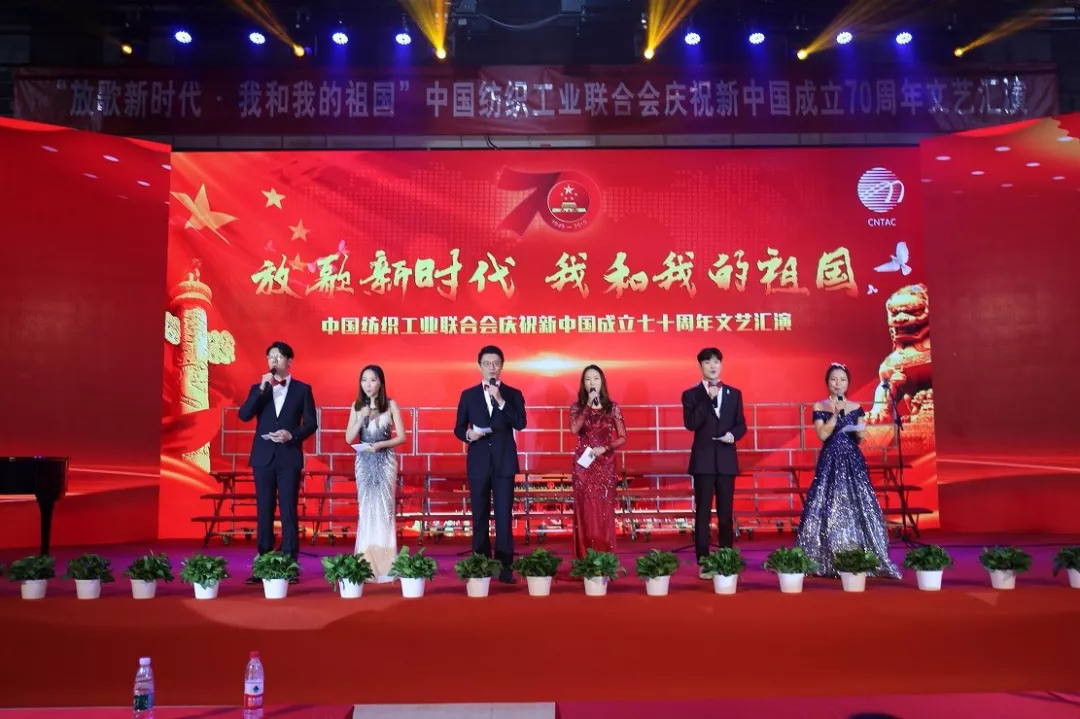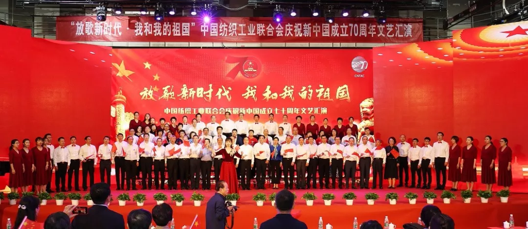 高勇指出,70年来,在中国共产党的领导下,昔日国弱民穷的中国发生了天翻地覆的变化,勤劳、勇敢、智慧的中国人民创造了一个个发展的奇迹,谱写了一篇篇壮丽的历史篇章。70年来,中国纺织业伴随着新中国的成长而发展壮大,特别是经过改革开放四十年,从最初的解决人民穿衣难到目前拥有全世界最为完善的现代纺织产业制造体系,不仅满足国内人民和各行业对纺织品的需求,更成为国家出口创汇的主力。中国纺织工业70年发展的辉煌,举世瞩目!我们心中充满自豪!高勇说,今天,在习近平新时代中国特色社会主义思想的指引下,我们不忘初心、牢记使命,在绿色、科技、时尚的主旋律下,用纺织人永不懈怠、勇于创新的精神,秉承服务纺织、造福民生的宗旨,用我们的智慧与能力、责任与担当,在建设纺织强国的道路上奋勇迈进。最后,高勇说道,此时此刻,我们满怀激情,用歌声、舞蹈、书画、诗朗诵等形式,来表达对新中国70华诞的祝福。祝福我们的祖国更加繁荣富强!祝愿伟大祖国明天更加美好!70年波澜壮阔的征程,我们一起走过;70年沧海桑田的巨变,我们一起见证;70年繁荣昌盛的画卷,我们一起编织;70年春华秋实的收获,我们一起分享。今天,山河同秀,大地礼赞,纺织工业,华章再续,更吐新篇。今天,追梦跨越,圆梦奋斗,中纺联全体同仁,高唱赞歌,气势磅礴。今天,我们共聚一堂,在共和国新时代的丰碑前汇聚,让伟大的梦想腾飞;今天,我们一起出彩,共享14亿中华儿女的美好生活,把报国初心与祖国母亲贴得更近。